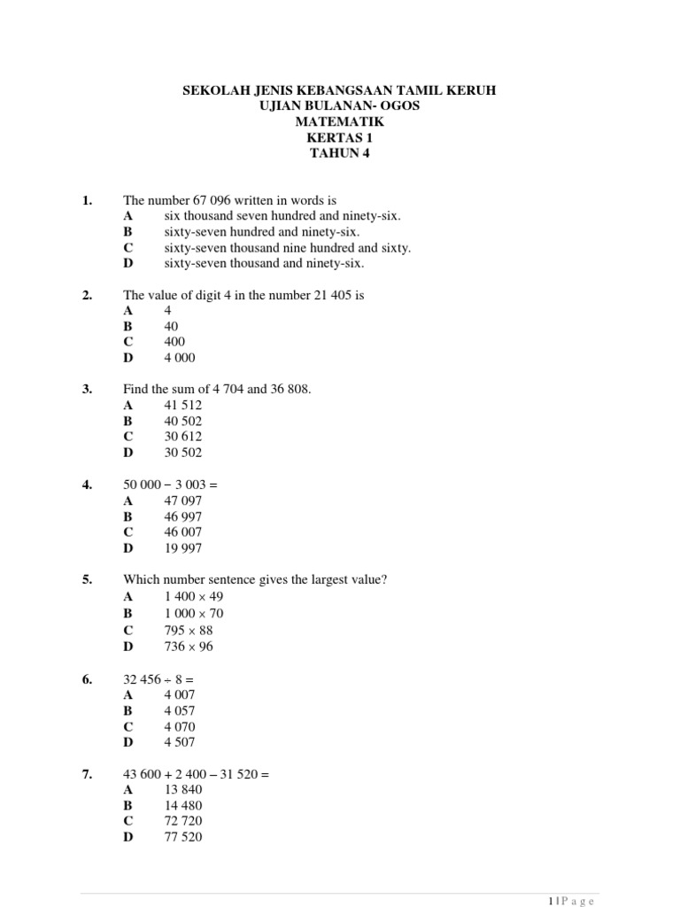 Contains uts (middle semester examination) questions and uas (semester final exams) odd and even semester. Soalan ujian bulan mac matematik tahun 4 2018. Sekolah kebangsaan panchang pedena 45300 sg besar ujian mac 2018 matematik tahun 4 (kertas 1) satu jam nama murid bentuk dengan bilangan paling sedikit ialah a c b d 7 36. Soal pts matematika ini sudah dilengkapi dengan kunci jawaban. Latihan matematik tahun 4, ujian matematik tahun 6, soalan math tahun 4,5 dan 6.