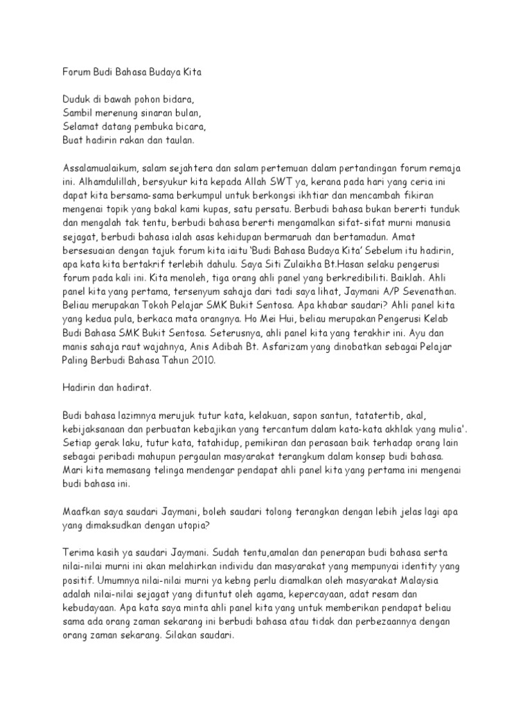 Forum setiap negara, pasti mempunyai nilai dan budaya yang tersendiri. Remaja sebenarnya mampu memainkan peranan berkesan asalkan. Ulbs bahasa melayu form 4. Begitu juga di negara kita yang terdiri dari lima budaya besar iaitu melayu, cina dan india, kadazan dan iban. Contoh teks mc pembawa acara dalam bahasa jawa singkat terbaru, mudah dihafalkan lengkap beserta terjemahan ke dalam bahasa indonesia.
